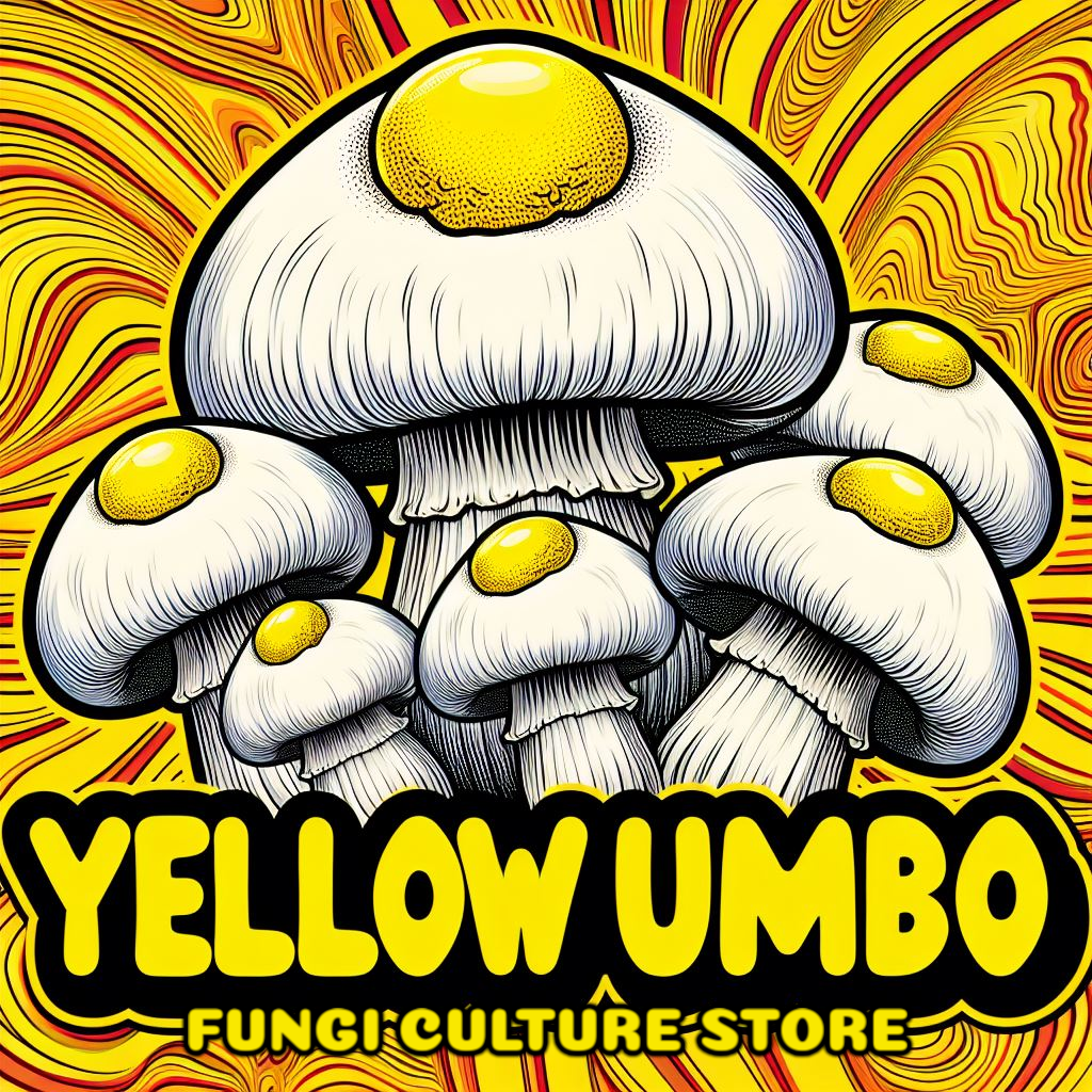 10 ML Syringe Yellow Umbo is a interspecies hybrid of P. cubensis (Jack Frost) and P. natalensis. Crossed and stabilized by Yoshi Amano. Named for the the isolation's main identifying feature, a yellow center that is raised (an umbo). It's cap edges curl up at maturity.